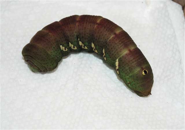 "It will eat loose leaves, but the ones attached still to vine will maintain moisture content longer and are better for caterpillar. Here is page for Craighead County, Arkansas. Goto http://www.silkmoths.bizland.com/arCraigheadsphlar.htm. Once you are there, Click on the link on that page where it says "For care of "found larvae/caterpillars" visit Manduca sexta larva, central Texas, August 21, 2008, Trina Woodall", and that will tell you how to care for found larvae. I would like to make a similar page for Sebastian County and so would like to receive a jpg image of the larva. If kept warm over winter it might emerge in mid winter when you would not be able to release it. Once you get it to pupa stage, send me another email and I will send further instructions, but I think most of what you need to know is answered on the link above."