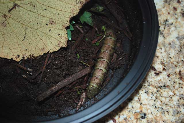 Kellie writes, "I have found today a large green caterpillar that I think is the Eumorpha pandorus you write about in your website. I put it in a jar with dirt and leaves so my son could take it to school. I think it is mature as it has no horn and has a spot on its rear end. We have mostly oak around our house, but also much Virginia Creeper - which I was happy to read on your website is a food source for the caterpillar. Can you tell me if we would be able to keep the caterpillar captive during this process and let my son's class witness the process of metamorphosis? I could collect Virginia Creeper for it to eat as there are scads of it in the yard. I would send pictures as it develops if that would be helpful. Please advise! Thanks very much for your very informative site."