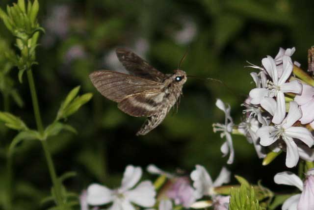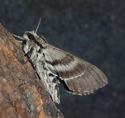 The Hermit sphinx, Lintneria eremitus (Wing span: 2 9/16 - 2 15/16 inches (6.5 - 7.5 cm)), flies from Maine south to North Carolina into northern Georgia (James K. Adams, 2002), west to Manitoba, South Dakota and Missouri. It has been seen in southeastern North Dakota (Gerald Fauskes).In most of the older literature this moth is classified as Sphinx eremitus. James P. Tuttle, in his The Hawk Moths of North America 2007, has placed it in the Lintneria genus. The upperside of the forewing is gray-brown with wavy lines, black dashes, and one or two small white spots near the center of the costa. The upperside of the hindwing is black with two white bands and a triangular black patch at the base. Note the golden hair on the thorax. Lintneria eremitus, June 29, 2005, Peterborough, Ontario, courtesy of Tim Dyson.