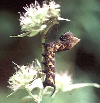 On August 10, 2006, Joan F. Rickert sent me this image of an immature Sphingidae larva feeding on Monarda in Taylor County, Wisconsin.I am pretty sure it is Lintneria eremitus based on thoracic scoli and foodplant, and, since Joan reports it is only about an inch long, I suspect it is in third instar. Congratulations to Joan on an unusual find. Hope she is able to send additional images as the larva matures. |