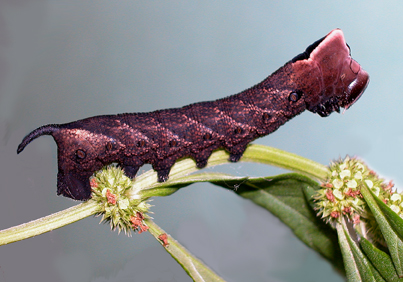 It is believed that all "Lintneria larvae will exhibit "a fleshy thoracic dorsal "horn" in the first 4 instars (unique in the Sphingidae of the world to my knowledge) which is replaced by a thoracic dorsal "hump" with a large black patch in the 5th instar." J.A. Tuttle.